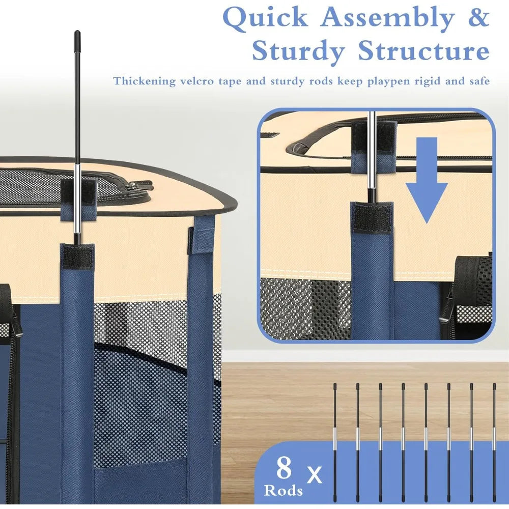Foldable Dog Playpen Portable Pet Cage for Animals, Indoor / Outdoor Travel Camping Use with Carrying Case Blue
